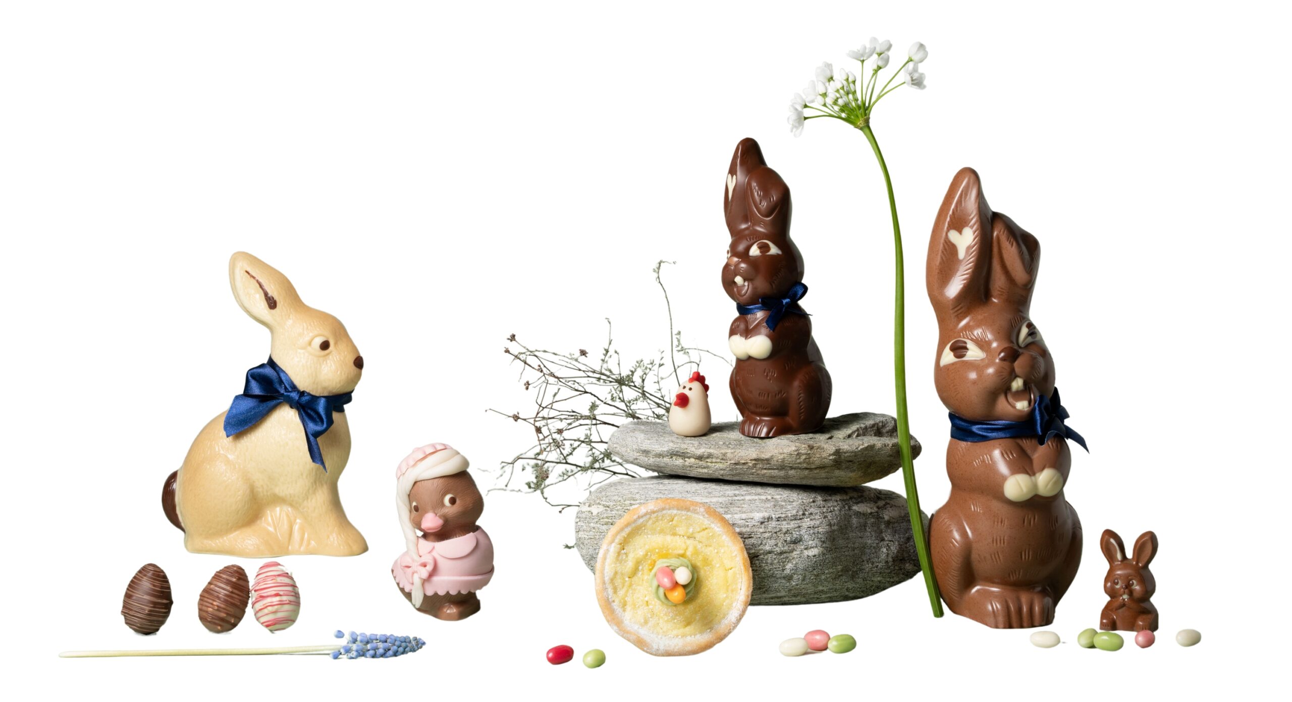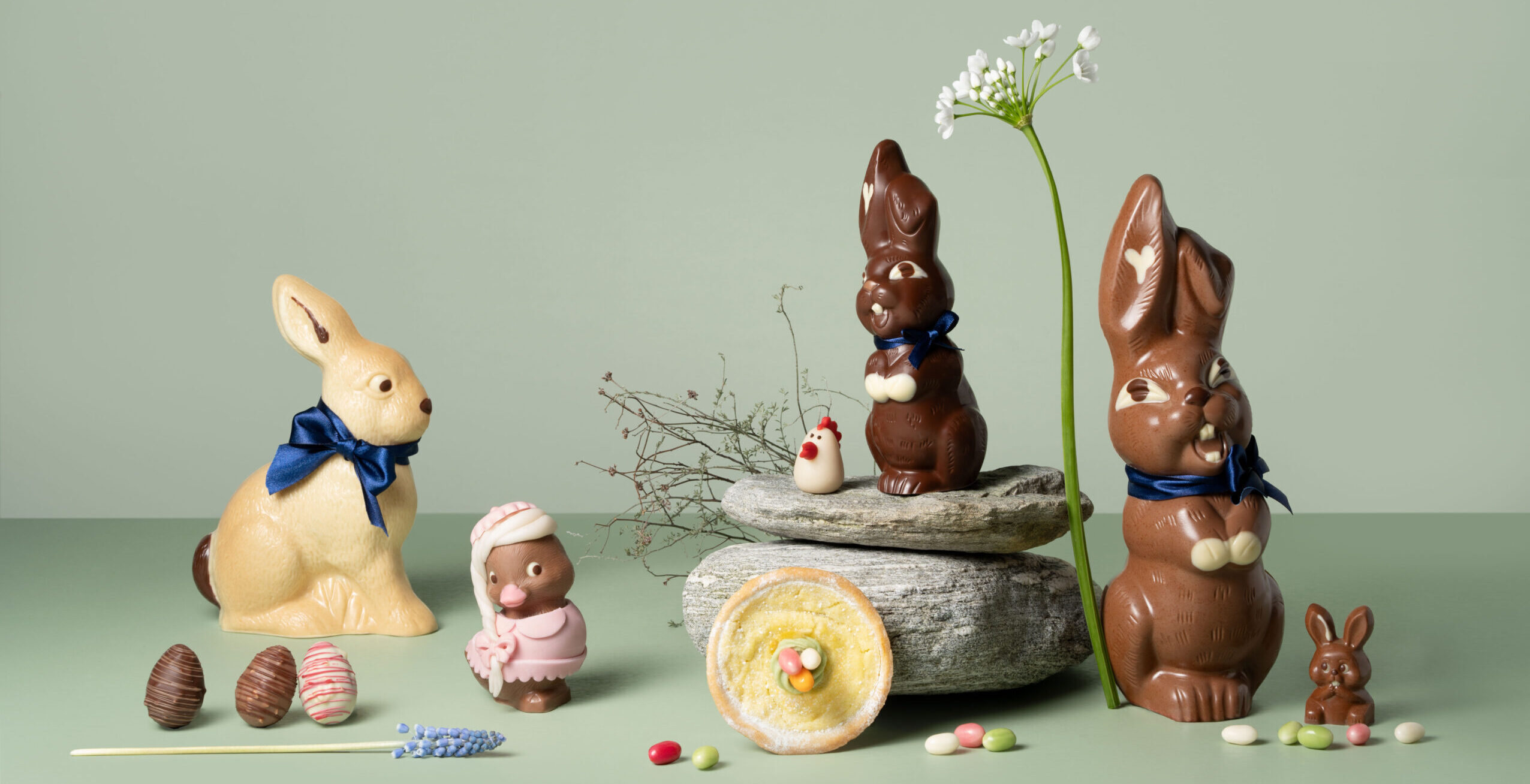 Unsere originellen Osterspezialitäten werden in Handarbeit gegossen, geformt und liebevoll verziert. Dabei verarbeiten unsere Confiseurinnen und Confiseure nur beste Zutaten wie unsere hauseigene Schokolade.